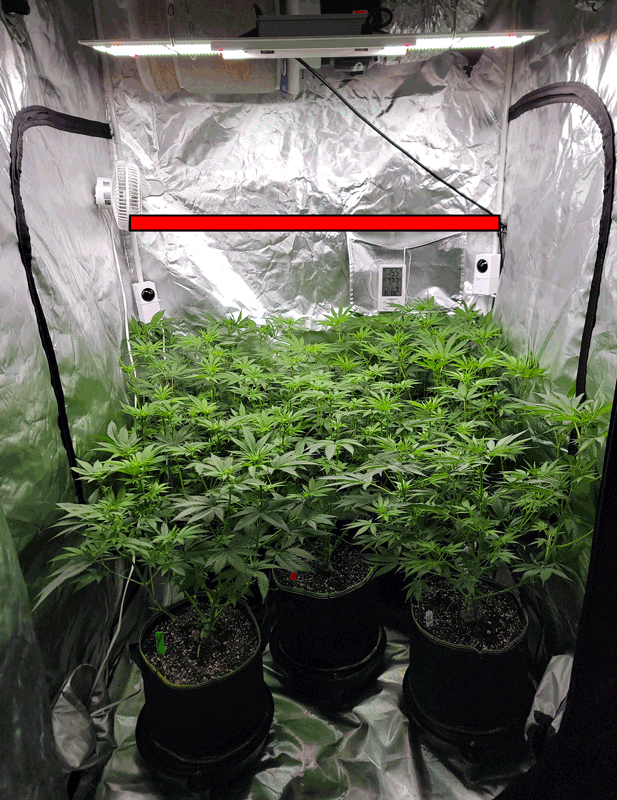 In the above picture, I placed the red line at the top of the back pocket in the grow tent, so you can easily see how much the plants grew over the last 7 days. I had to move the thermometer from that pocket because I couldn't see it anymore! Check out the full week 9 grow journal entry to see everything that happened!